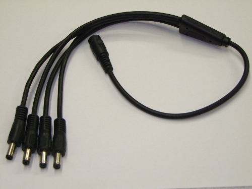 New 2 Pack of 16" DC/AC 2.1MM Power Plug Four Way splitter: 2 Pack 16 inches 18 Gauge Copper AC/DC 2.1MM Power Plug Four Way splitter. Use it to quick connect power right in to you security camera and Microphone multiple cameras or any low voltage device using 2.1MM power plug Simplify your installation when using plug in power supply